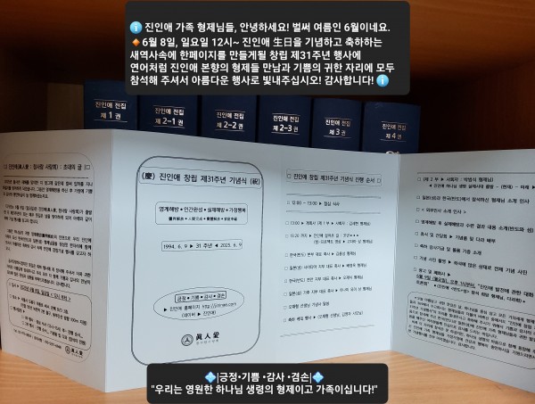 중요 행사 및 홍보 (경)진인애 창립 제31주년 기념 행사(축) 페이지 정보 작성자 최고관리자 작성일 25-10-16 23:50 조회 15회 댓글 0건 본문 ▨ 2025년 6월 9일=> 진인애 창립 제 31 주년 기념 행사 (서울 본부 사무실 = 6월 8일, 일요일 12시 부터~) 목록 답변 댓글목록 0 댓글목록 등록된 댓글이 없습니다. 전체 5건 1 페이지 중요 행사 및 홍보 게시물 검색 검색대상 제목 내용 제목+내용 회원아이디 회원아이디(코) 글쓴이 글쓴이(코) 검색 ⊙ 진인애 사무실 방문 안내 ⊙ 작성자최고관리자 10-19 진인애 전집 원본 (2007년 ~ 2017년 / 초자연… 작성자최고관리자 10-18 (경)진인애 창립 제31주년 기념 행사(축) 작성자최고관리자 10-16 = (慶) 진인애 창립 제 30 주년 기념식 (祝) = 작성자최고관리자 05-29 댓글 1 ⚃ 진인애 창립 제29주년 축하 기념식 ⚃ 작성자최고관리자 05-29