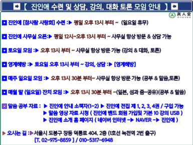 중요 행사 및 홍보 ⊙ 진인애 사무실 방문 안내 ⊙ 페이지 정보 작성자 최고관리자 작성일 25-10-19 09:01 조회 12회 댓글 0건 본문 ☎ 오전 10시 이후에~ 언제나 상담과 강의가 가능하오니, 전화주시고 방문해 주시면 감사하겠습니다.(Tel. 02-975-8859) 목록 답변 댓글목록 0 댓글목록 등록된 댓글이 없습니다. 전체 5건 1 페이지 중요 행사 및 홍보 게시물 검색 검색대상 제목 내용 제목+내용 회원아이디 회원아이디(코) 글쓴이 글쓴이(코) 검색 ⊙ 진인애 사무실 방문 안내 ⊙ 작성자최고관리자 10-19 진인애 전집 원본 (2007년 ~ 2017년 / 초자연… 작성자최고관리자 10-18 (경)진인애 창립 제31주년 기념 행사(축) 작성자최고관리자 10-16 = (慶) 진인애 창립 제 30 주년 기념식 (祝) = 작성자최고관리자 05-29 댓글 1 ⚃ 진인애 창립 제29주년 축하 기념식 ⚃ 작성자최고관리자 05-29